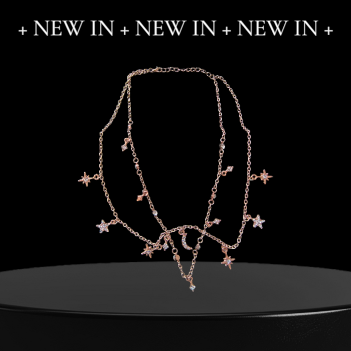 To wielowarstwowy naszyjnik w stylu boho z kryształkami, gwiazdkami i księżycem, dostępny w kolorze różowego złota lub podobnych odcieniach.