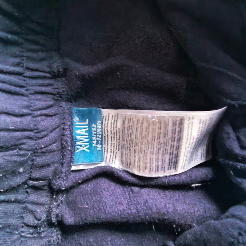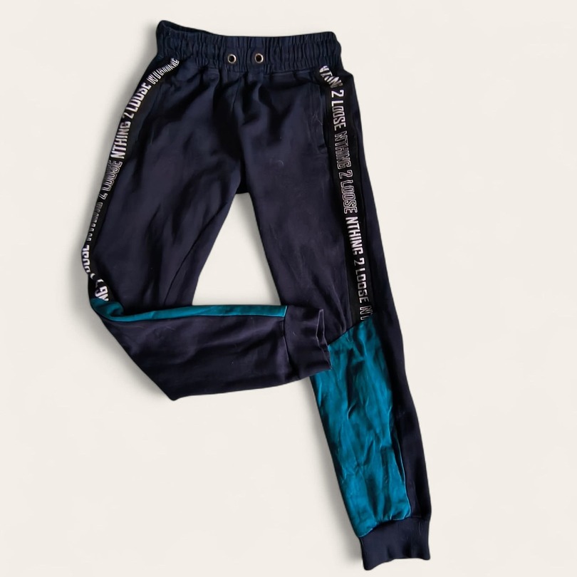 Opis: Spodnie mają czarny korpus, turkusowe wstawki w dolnej części nogawek oraz białe paski z powtarzającym się napisem po bokach.