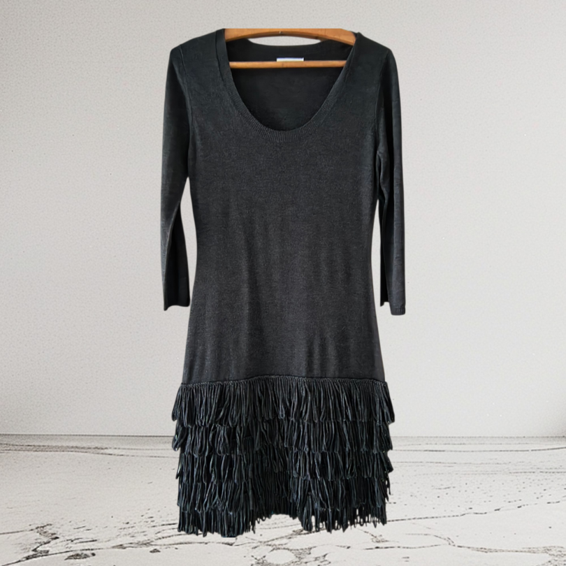 To szara sukienka sweterkowa Calvin Klein z frędzlami. Ten konkretny model charakteryzuje się warstwowymi frędzlami u dołu, dekoltem w łódkę (scoop neck) oraz rękawami o długości 3/4.